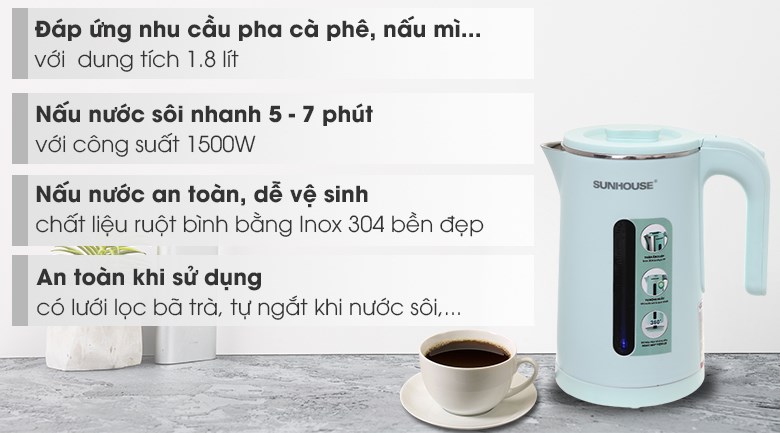 Ấm đun siêu tốc Sunhouse 1.8 lít SHD1351 của thương hiệu Việt Nam - Sunhouse, mẫu mã đẹp mắt, dung tích 1.8 lít, công suất 1500W, đế tiếp điện độ bền cao, đun nước an toàn, lựa chọn cho gia đình.