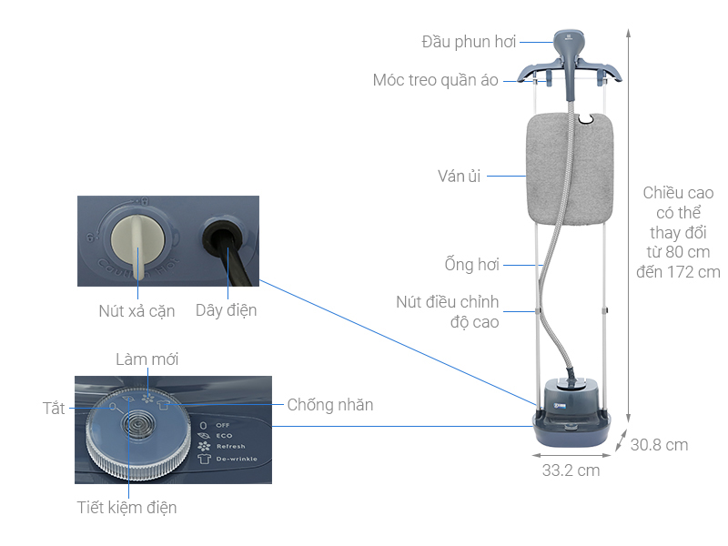 Tiện ích | Ủi nằm, ủi quần áo treo, chế độ tiết kiệm điện, điều chỉnh chiều cao, nút xả cặn |