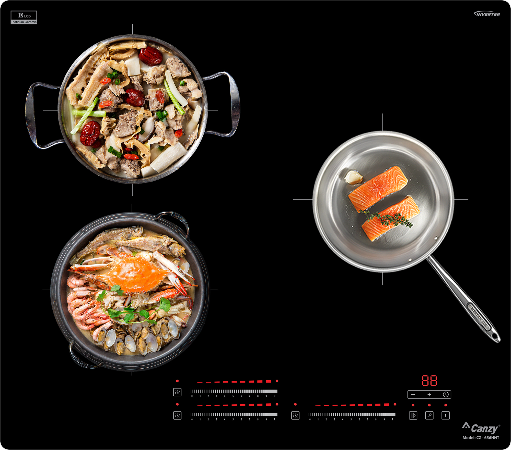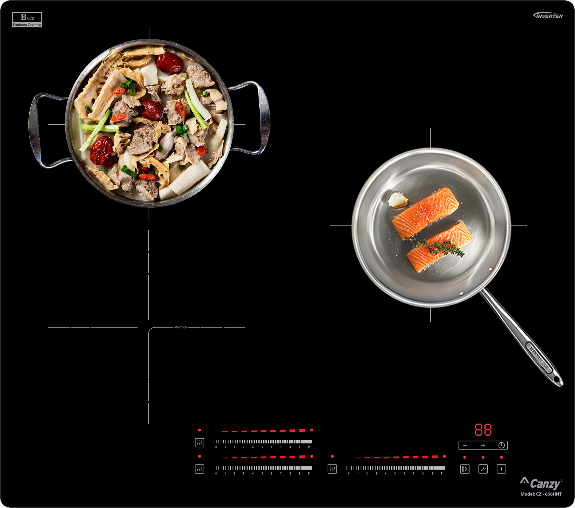 Bếp từ Canzy CZ-656HNT được tích hợp chức năng tự nhận diện vùng nấu, khi ta đặt nồi lên 1 trong 3 vùng nấu sau đó ấn nút khởi động bếp sau thời gian 1-2 giây bếp sẽ tự động tìm vùng nấu đã có nồi, ta chỉ việc điều chỉnh mức công suất to nhỏ theo ý muốn mà không phải thao tác chọn vùng nấu như bếp thông thường. Công nghệ Inverter được áp dụng trên bếp từ có khả năng phản ứng thay đổi công suất theo điều khiển ngay tức thì, khi người dùng điều chỉnh tăng giảm nhiệt độ đun nấu, bếp điều chỉnh thay đổi tức thì về mức nhiệt độ mong muốn.