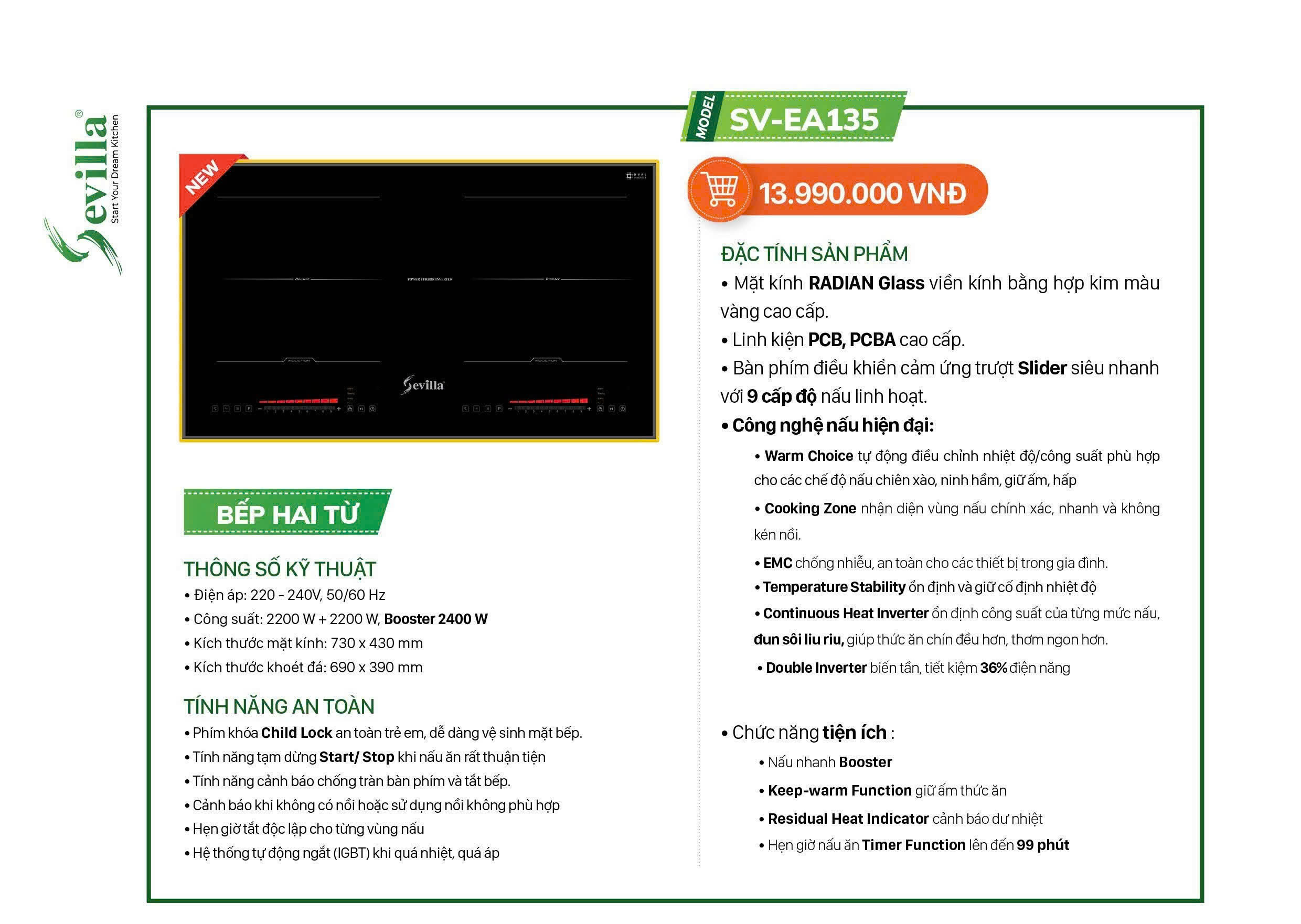Sevilla SV-EA135 không chỉ là một chiếc bếp từ thông thường, mà là người bạn đồng hành đắc lực trong hành trình nâng tầm chất lượng cuộc sống gia đình. Với công suất mạnh mẽ 4400W, công nghệ Double Inverter tiết kiệm 36% điện năng, thiết kế sang trọng với mặt kính RADIAN Glass viền vàng, cùng hàng loạt tính năng thông minh như Warm Choice, Cooking Zone, Slider 9 cấp độ và hệ thống an toàn đa tầng, SV-EA135 xứng đáng là lựa chọn hàng đầu cho gian bếp hiện đại năm 2025.