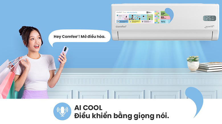 - Kết nối Wifi và điều khiển bằng giọng nói: cho phép người dùng tùy chỉnh nhiệt độ và điều khiển điều hòa từ xa thông qua ứng dụng NetHome Plus. Ngoài ra, bạn có thể điều khiển máy lạnh bằng giọng nói một cách tiện lợi, chỉ cần ra lệnh như: “Hey Comfee! Mở máy lạnh.”