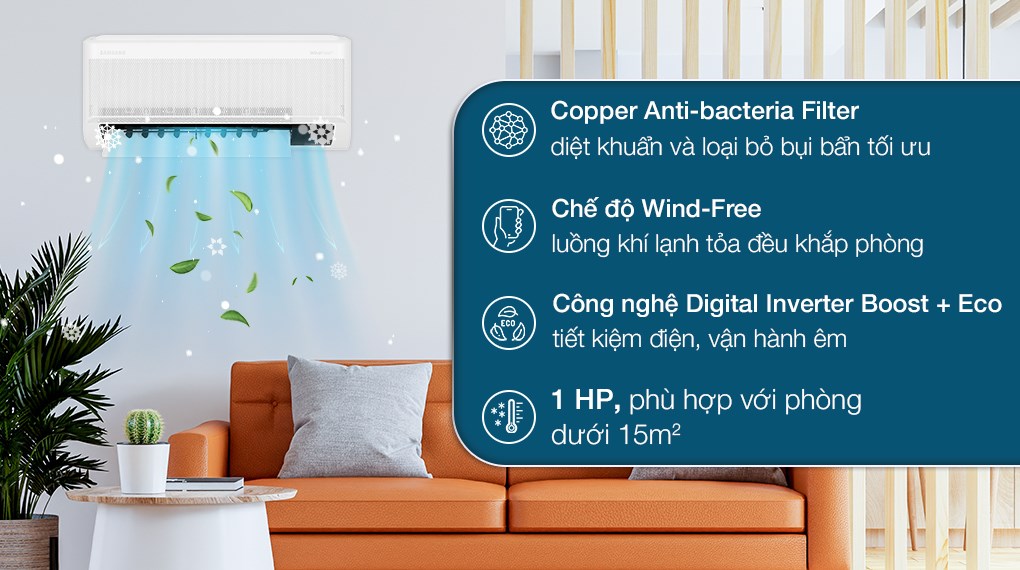 - Tính năng nổi bật: Làm lạnh nhanh, không cần cục nóng ngoài trời, công nghệ WindFree giảm gió lạnh trực tiếp, lọc bụi mịn, kết nối thông minh.