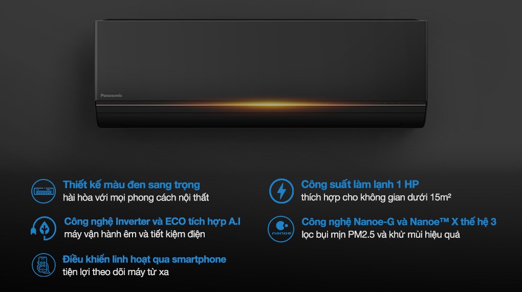 Điều hòa Panasonic Inverter 9550 BTU CU/CS-AU9BKH-8 là lựa chọn lý tưởng cho các không gian nhỏ dưới 15m², như phòng ngủ hoặc phòng làm việc cá nhân. Sản phẩm gây ấn tượng với thiết kế đen nhám sang trọng, dễ dàng hòa hợp với nhiều phong cách nội thất hiện đại. Nhờ công nghệ Inverter kết hợp ECO A.I, máy vận hành êm ái, tiết kiệm điện và duy trì hơi lạnh ổn định. Bộ lọc Nanoe-G và Nanoe™ X thế hệ 3 giúp loại bỏ bụi mịn PM2.5, khử mùi và ức chế vi khuẩn, mang đến bầu không khí trong lành hơn.