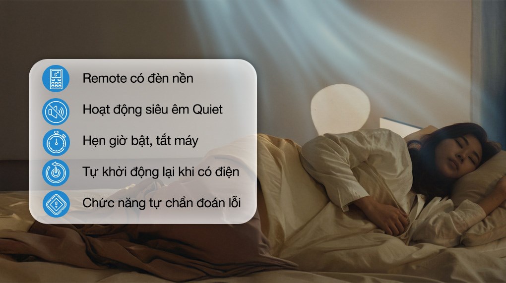 | Tiện ích | - Đèn báo chất lượng không khí <br> - Điều khiển từ xa <br> - Điều khiển bằng điện thoại, có Wi-Fi <br> - Vệ sinh bên trong dàn lạnh: Inside Cleaning <br> - Remote có đèn nền <br> - Dàn nóng phủ lớp BlueFin chống ăn mòn <br> - Chức năng tự chẩn đoán lỗi <br> - Chế độ ngủ đêm Sleep cho người già, trẻ nhỏ <br> - Chế độ kiểm soát độ ẩm <br> - Hoạt động siêu êm Quiet <br> - Hẹn giờ bật, tắt máy <br> - Tự khởi động lại khi có điện |