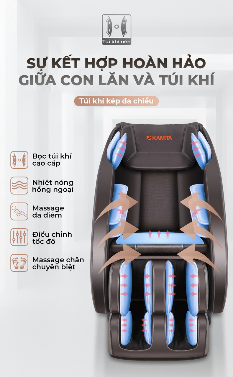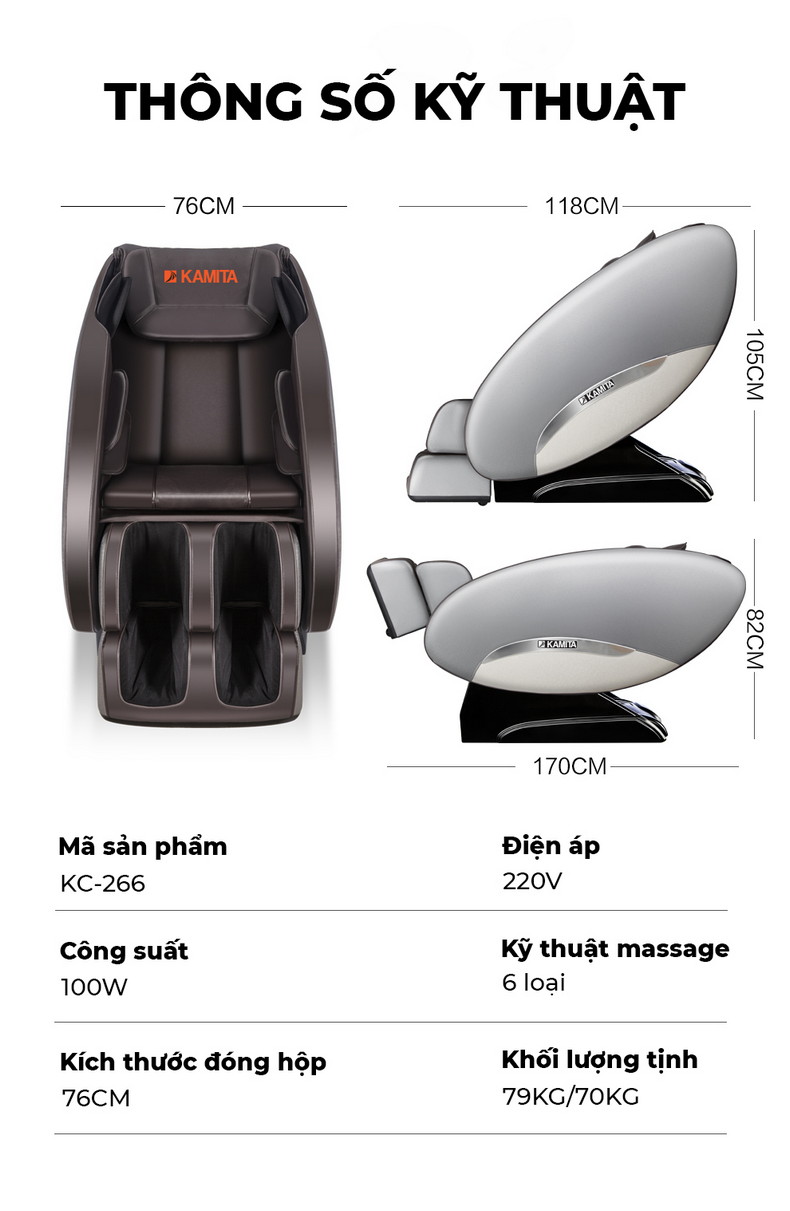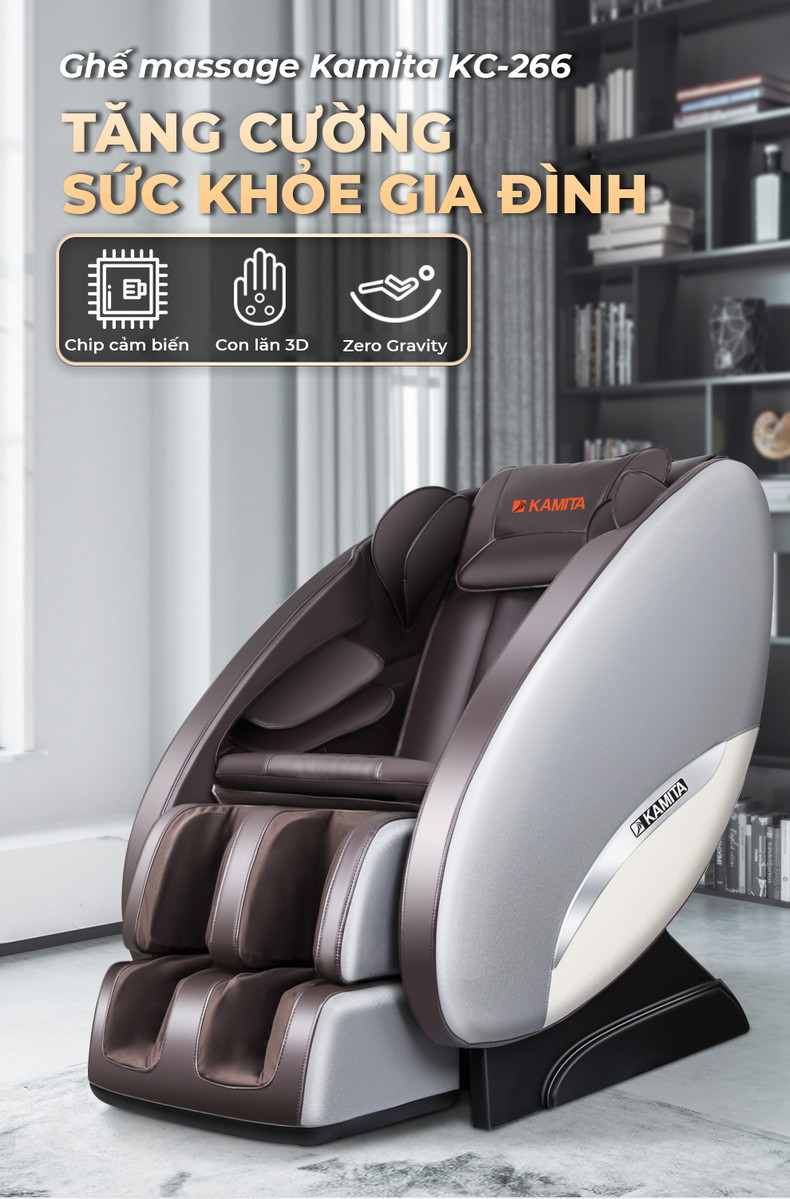 Ghế massage Kamita KC-266 là sản phẩm chăm sóc sức khỏe thông minh được ứng dụng các công nghệ độc quyền của Nhật Bản. Ghế massage KC-266 thế hệ mới của Kamita được tích hợp tới 20 tính năng hoàn hảo, giúp Quý khách hàng có được trải nghiệm massage chân thật và hiệu quả nhất.