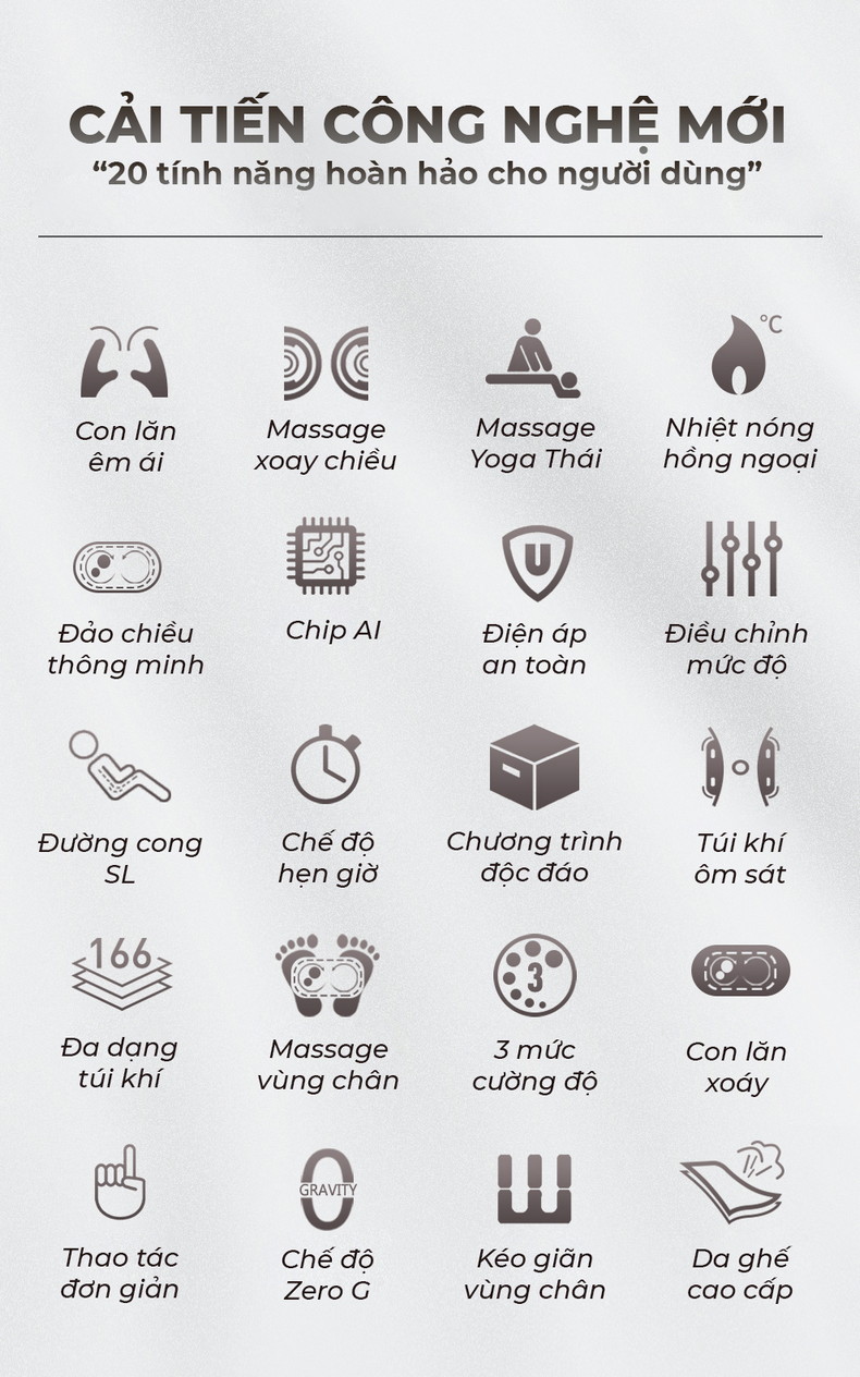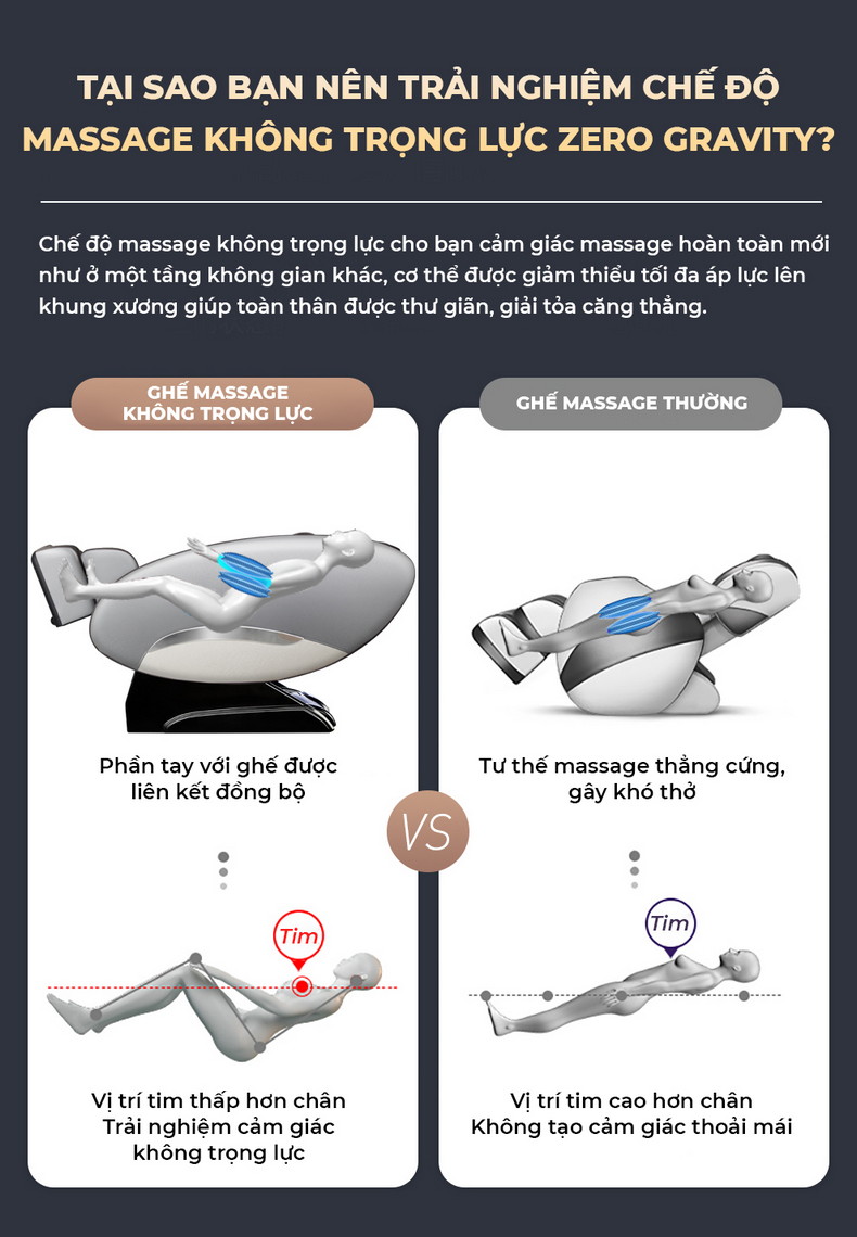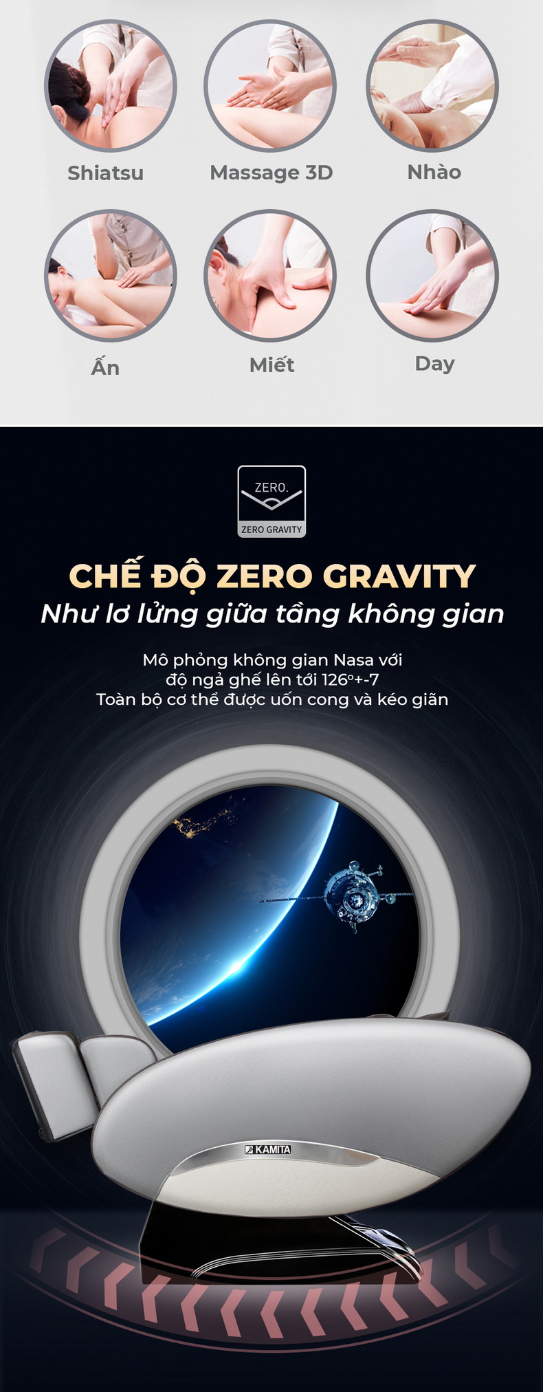 Chế độ Zero-Gravity của ghế massage Kamita KC-266 được xem là bước đột phá lớn trong công nghiệp sản xuất ghế massage hiện nay. Các nhà khoa học NASA đã tìm ra được định luật giúp phi hành gia chống lại lực hút lớn bằng cách thực hiện tư thế ngả người ra sau và nâng cao chân tạo thành góc nghiêng 120 - 130 độ. Từ những phát hiện nay, các dòng ghế massage cao cấp của Kamita đã nhanh chóng trang bị thêm tính năng không trọng lực nổi tiếng. Khi thực hiện chế độ Z-Gravity, ghế massage Kamita KC-266 tạo góc nghiêng lên tới 126 +/- 7 độ, giúp các con lăn và túi khí ôm sát người để massage sâu và nâng đỡ cơ thể.