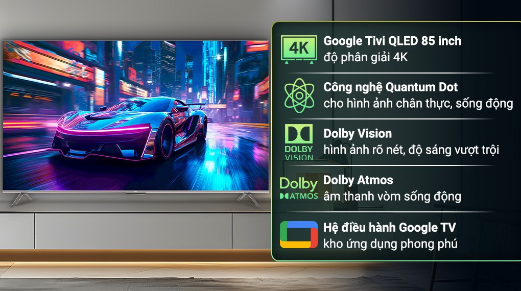 Google Tivi QLED Aqua 4K 85 inch AQT85S800UX biến không gian phòng trong nhà bạn thành một rạp chiếu phim thu nhỏ với màn hình 85 inch có độ phân giải 4K, công nghệ hình ảnh Dolby Vision cùng công nghệ âm thanh vòm Dolby Atmos mang đến trải nghiệm nghe nhìn chuẩn rạp chiếu. Hệ điều hành Google TV mang đến kho ứng dụng phong phú đáp ứng nhu cầu giải trí cho các thành viên trong gia đình.