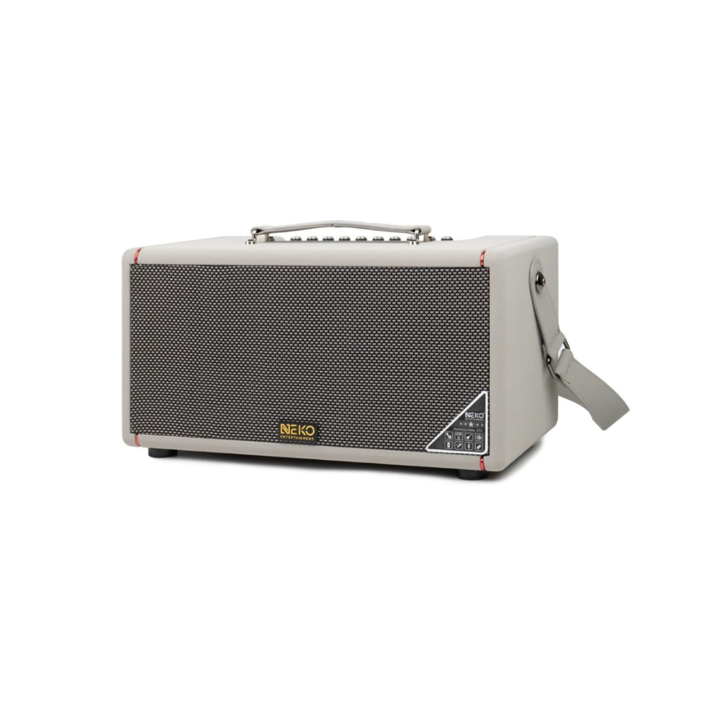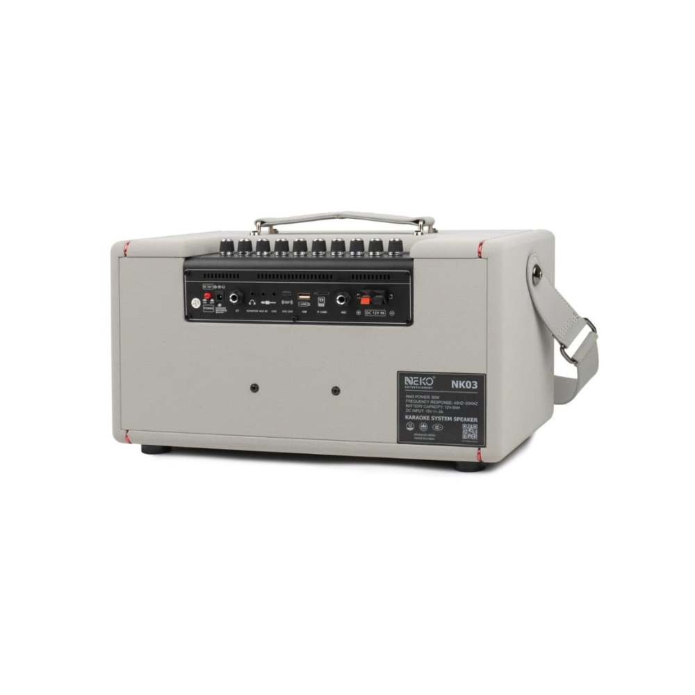 Neko NK03 sở hữu tay xách và dây da đeo chắc chắn, cực kỳ thuận tiện cho người dùng khi di chuyển trên các chuyến đi xa hay các buổi tiệc cùng bạn bè… Toàn bộ mặt trước NK03 là ê căng vải mềm được gắn vào khung gỗ cứng nhằm bảo vệ hệ thống loa bên trong, nổi bật trên đó là biểu tượng logo của hãng NEKO, như niềm tự hào luôn mang niềm vui và hạnh phúc tới quý khách hàng khi dùng sản phẩm của hãng.