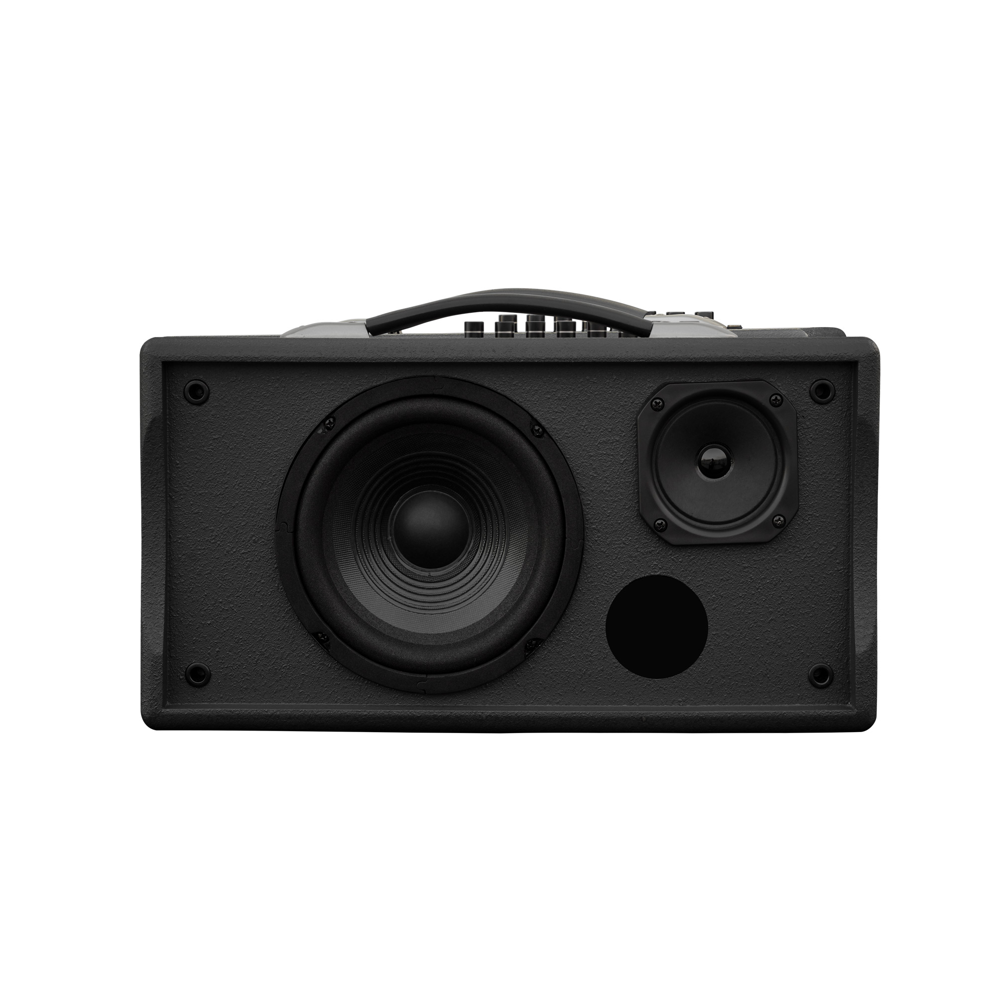Tay xách nhôm đúc giúp di chuyển dễ dàng. Trọng lượng 10 kg vừa đủ để đảm bảo độ ổn định âm thanh nhưng vẫn tiện mang đi xa.