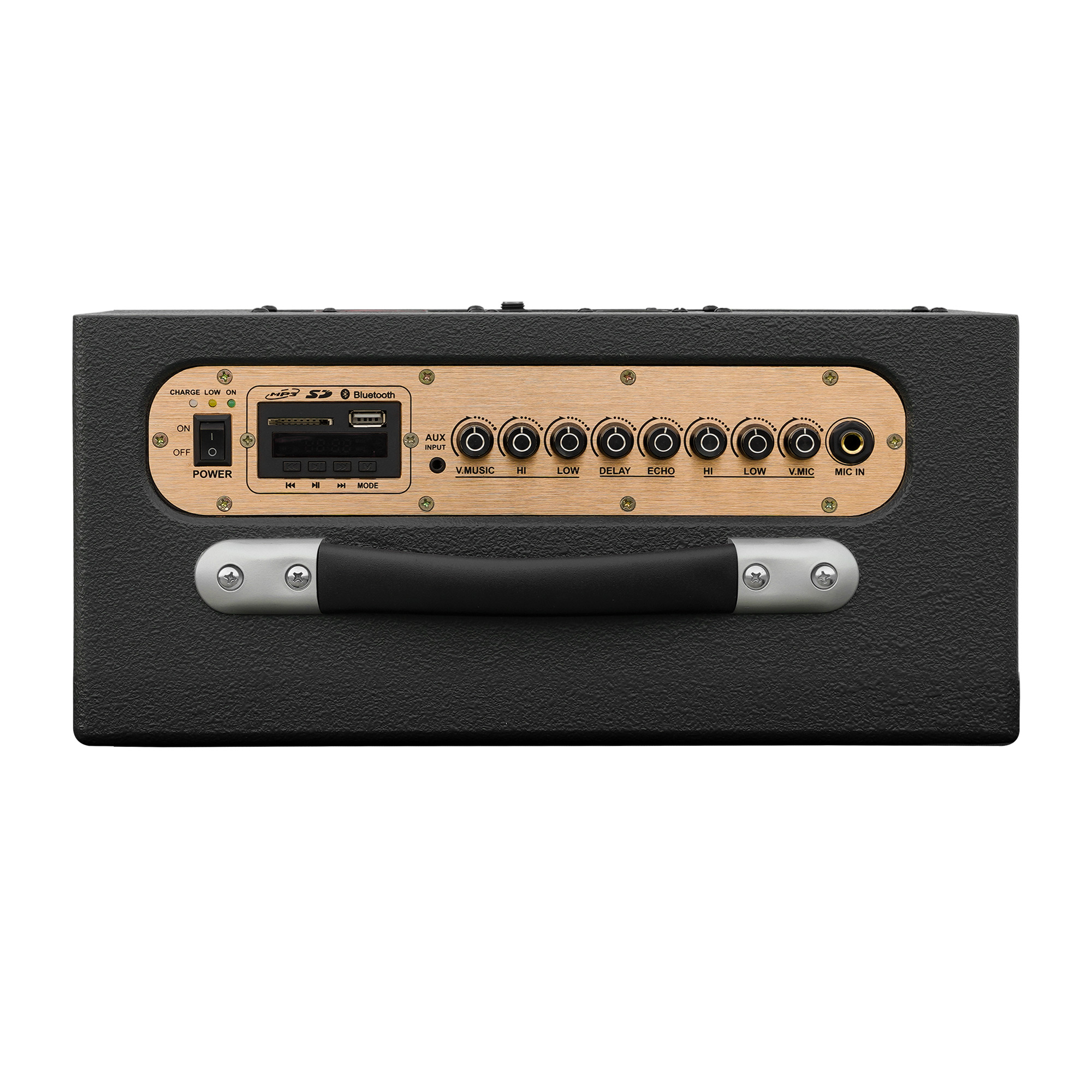 Người dùng có thể tùy chỉnh treble, bass, echo trực tiếp trên bảng điều khiển nhôm phay xước tinh tế. Cảm giác thao tác mượt, chính xác, giúp tối ưu chất lượng âm thanh theo không gian.