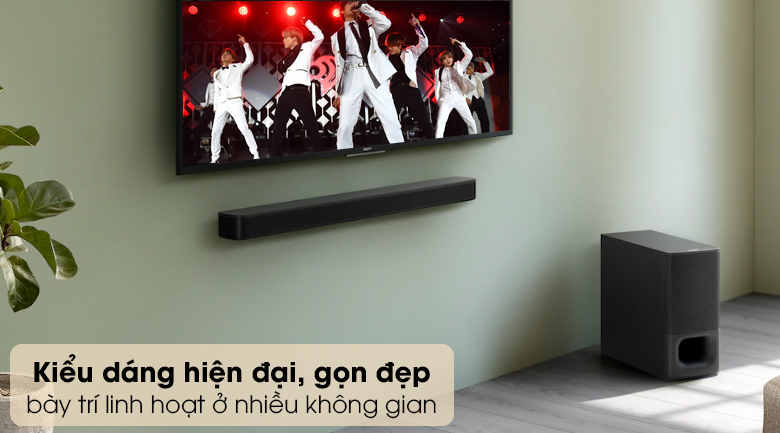 - Với thiết kế thanh mảnh, loa thanh có thể đặt trên kệ tivi hoặc treo tường để tiết kiệm diện tích.