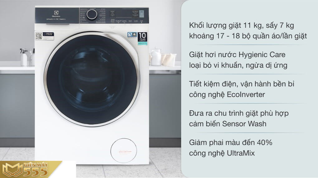 - Giặt 11kg, sấy 7kg, công nghệ sấy nhiệt, diệt khuẩn, tiết kiệm điện.