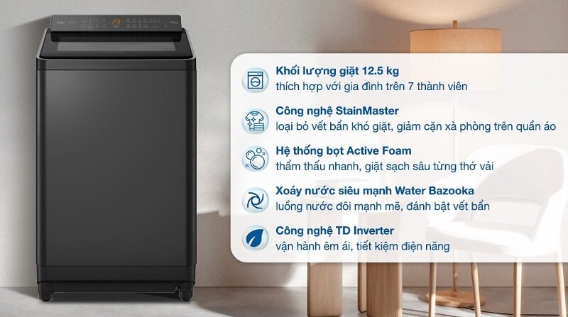 - Giặt được chăn đôi, ga king size, tiết kiệm điện nước, nhiều chế độ giặt