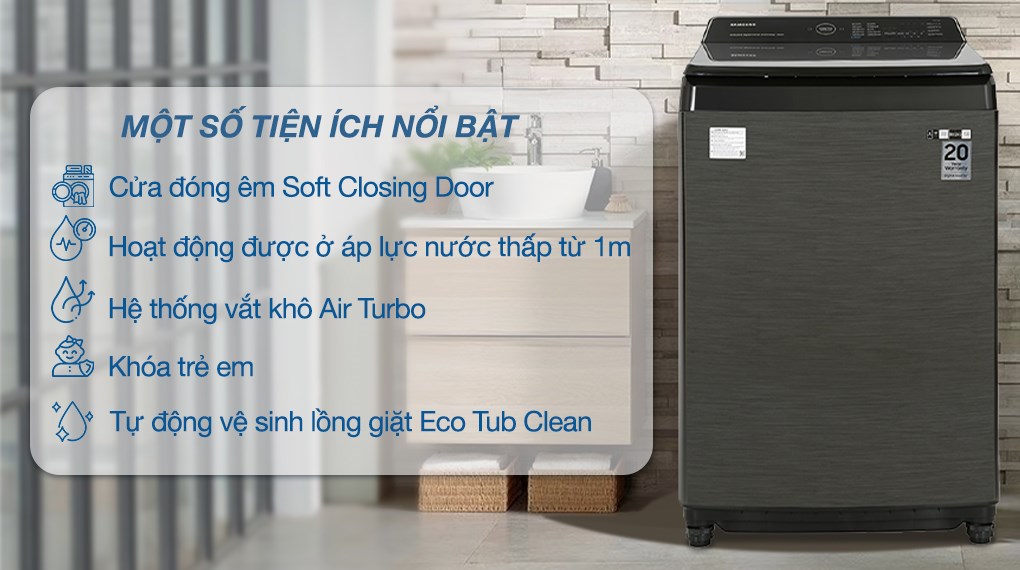 | Tiện ích | Điều khiển máy giặt bằng smartphone qua ứng dụng SmartThings; Tự động vệ sinh lồng giặt Eco Tub Clean; Tự động vệ sinh lồng giặt; Tự khởi động lại khi có điện; Khóa trẻ em; Hệ thống vắt khô Air Turbo; Hẹn giờ giặt; Hoạt động ở áp lực nước thấp từ 1 m; Cửa đóng êm Soft Closing Door |