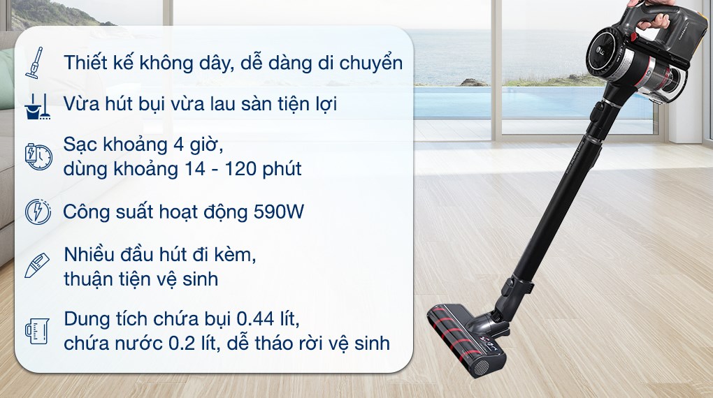 + Đầu lau sàn: Giảm thời gian dọn dẹp của bạn bằng cách hút bụi và lau nhà cùng một lúc.