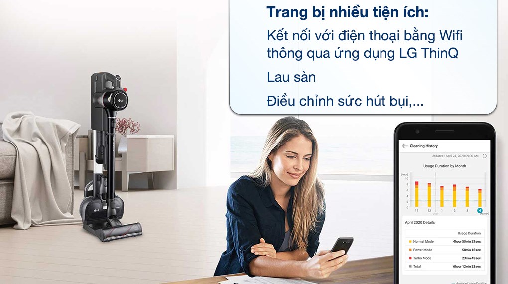 - Kết nối được với ứng dụng LG ThinQ giúp bạn theo dõi được lịch sử vệ sinh: thời gian và chế độ vệ sinh, đồng thời biết được thời gian vệ sinh bộ lọc.