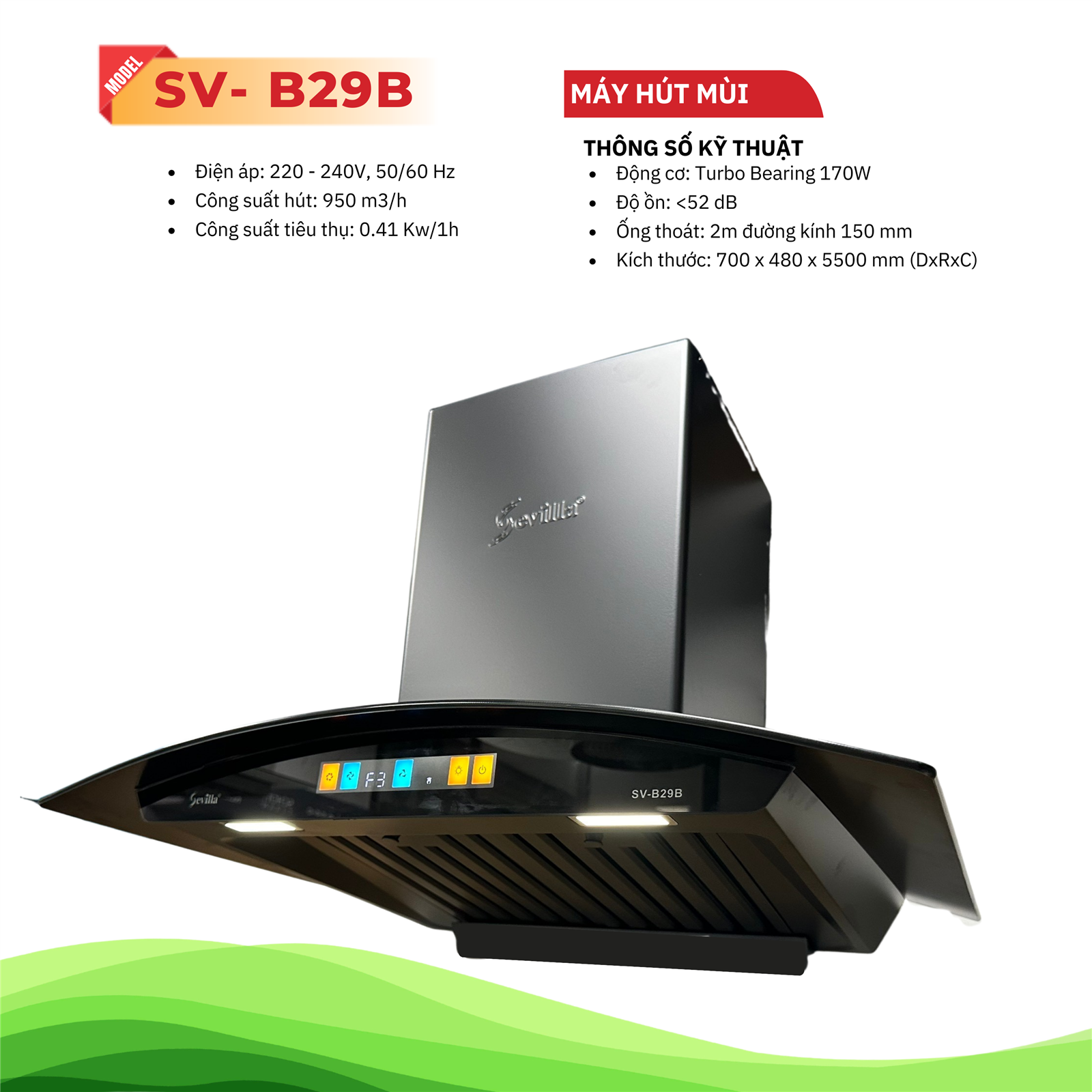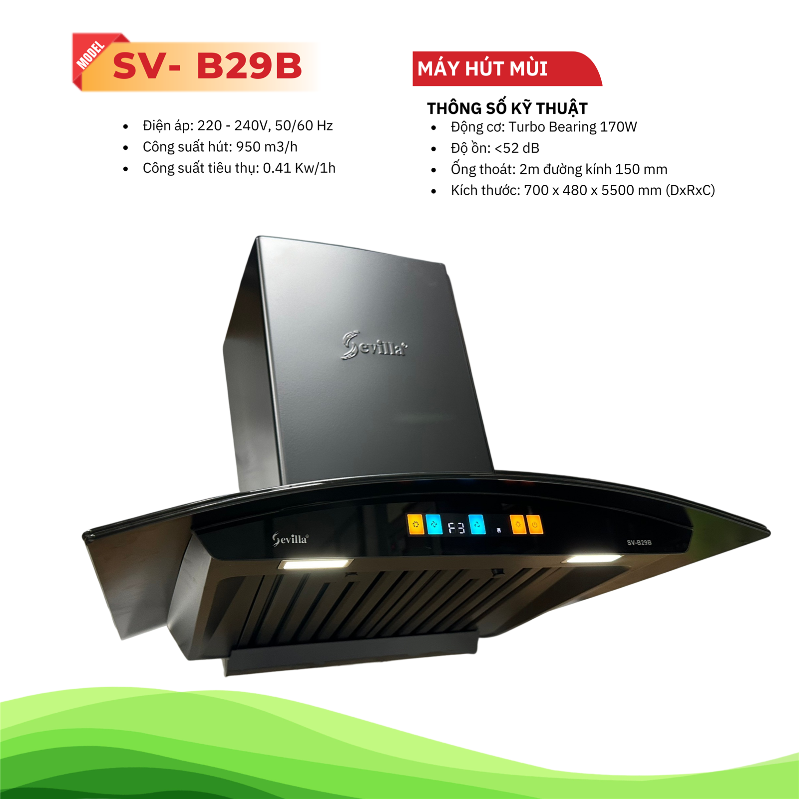 Máy hút khói khử mùi cao cấp SV-B29B là giải pháp toàn diện cho mọi vấn đề mà bạn đang gặp phải với không gian bếp. Với công suất hút 950m³/h mạnh mẽ, công nghệ điều khiển vẫy tay Touch By Hand hiện đại, động cơ đồng cao cấp 97% bền bỉ, hệ thống lọc kép hiệu quả và thiết kế sang trọng, SV-B29B mang đến cho bạn không gian bếp trong lành, sạch sẽ và thẩm mỹ. Đặc biệt, với công nghệ biến tần Tubor Inverter, bạn sẽ tiết kiệm đáng kể chi phí điện năng mỗi tháng.