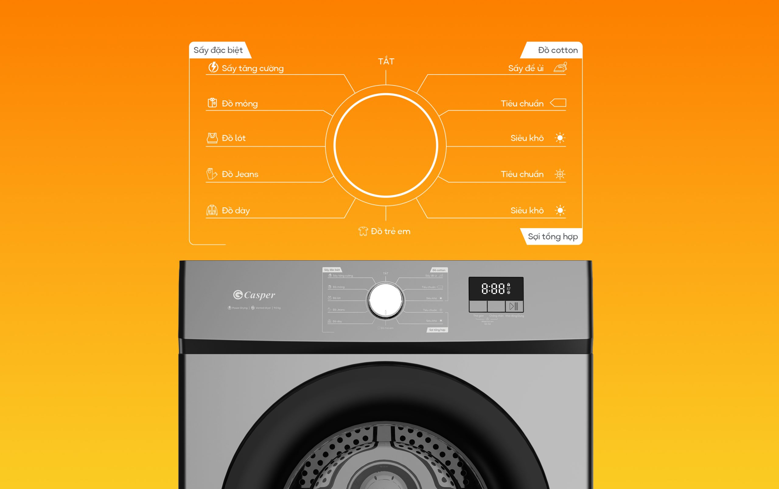 Với tính năng cảm biến độ ẩm, máy sấy Casper sẽ tự động điều chỉnh thời gian và mức nhiệt phù hợp. Nhờ đó, quần áo được sấy ở điều kiện hợp lý, giúp giảm thiểu tình trạng co rút, biến dạng hoặc nhăn vải sau khi sấy và tiết kiệm năng lượng hơn.