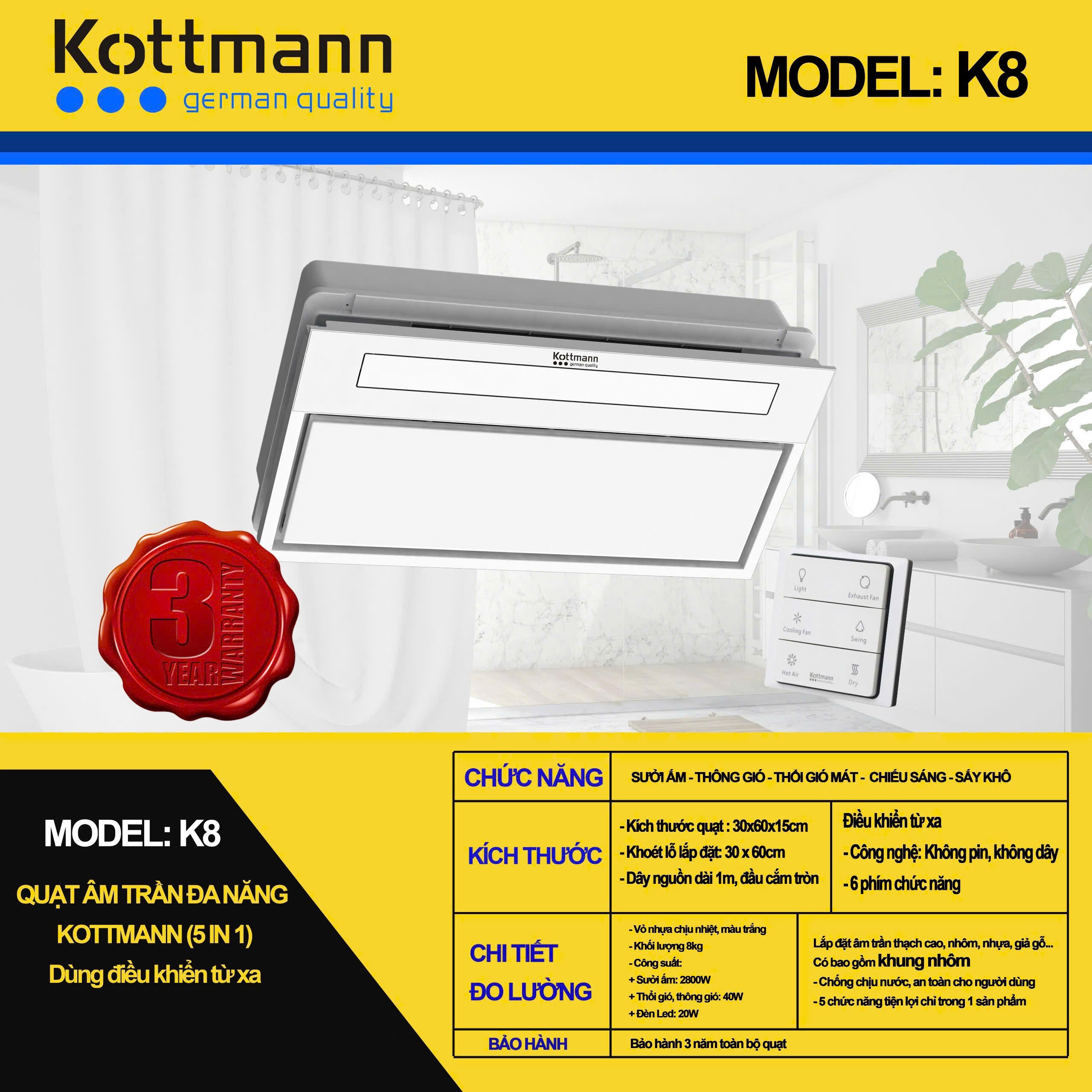 Quạt âm trần đa năng Kottmann K8 chính là mảnh ghép hoàn hảo cho một cuộc sống tiện nghi và an toàn. Với khả năng xử lý mọi vấn đề từ nhiệt độ, độ ẩm đến ánh sáng chỉ trong một thiết bị duy nhất, K8 không chỉ là một món đồ điện gia dụng mà là sự nâng tầm chất lượng sống cho cả gia đình. Đừng để phòng tắm ẩm thấp làm ảnh hưởng đến sức khỏe của bạn, hãy trang bị ngay Kottmann K8 để tận hưởng không gian chuẩn resort ngay tại nhà.