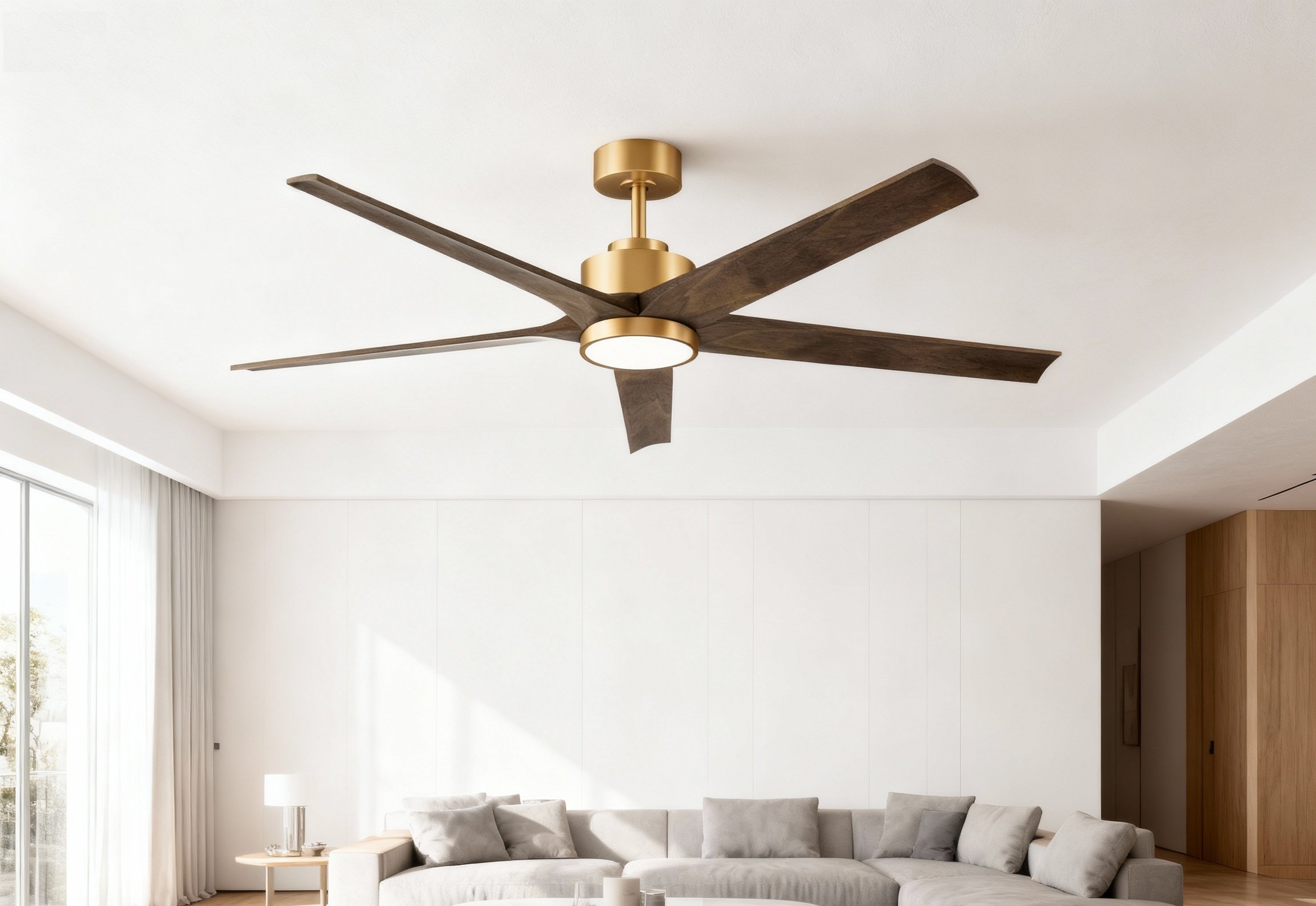 Cánh gỗ tự nhiên kết hợp thân quạt màu đồng sáng tạo nên vẻ đẹp sang trọng, dễ phối hợp với nhiều phong cách nội thất. Khoảng cách trần hợp lý giúp quạt vận hành hiệu quả mà vẫn đảm bảo an toàn.