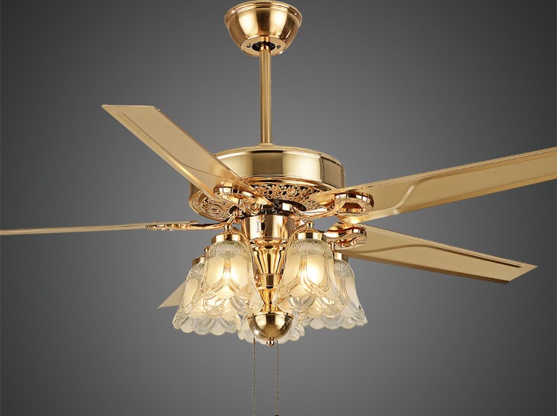 - Đặc điểm: Cánh quạt bằng kim loại mạ vàng hoặc đồng, kết hợp với đèn LED hoặc đèn chùm nhỏ.