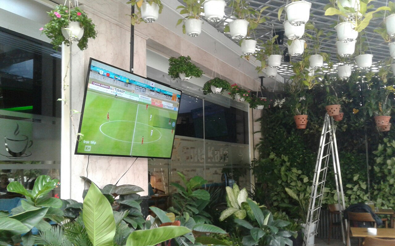 - Quán cà phê, nhà hàng, phòng chờ: Treo tivi cao sát trần giúp nhiều người cùng quan sát mà không bị che khuất bởi bàn ghế, vật dụng.
