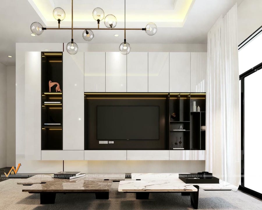 - Tivi quá cao dễ mất cân đối tổng thể nội thất: Nếu không phối hợp với kệ, tủ, hệ thống dây dẫn giấu kín, tivi sẽ trông lạc lõng, phá vỡ bố cục không gian.