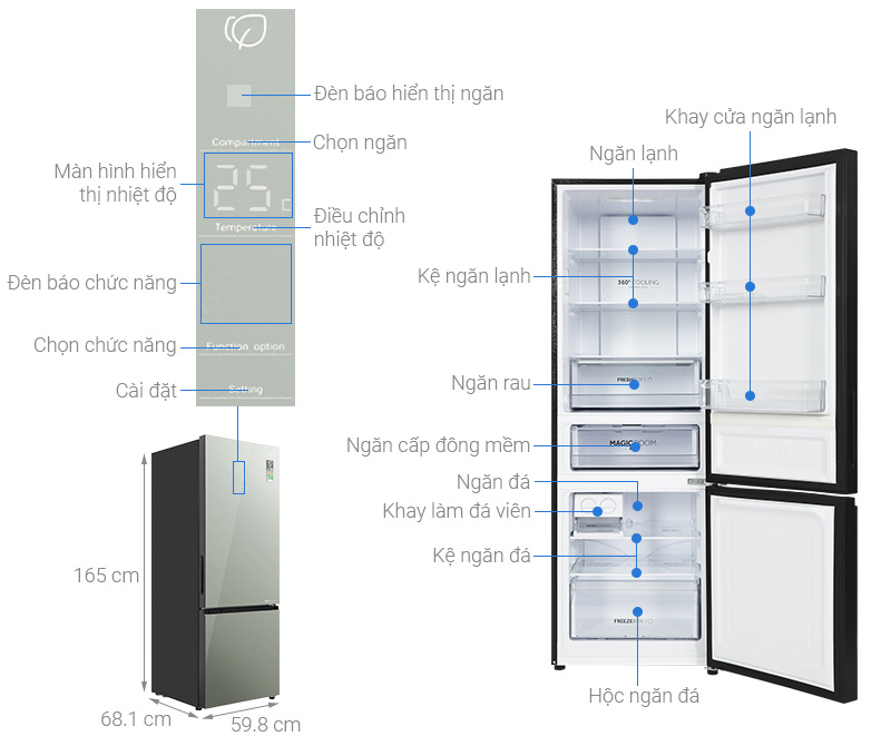 | Tiện ích | - Làm lạnh nhanh - Hộp đá xoay di động - Chức năng thông minh tự điều chỉnh nhiệt độ từng ngăn - Bảng điều khiển cảm ứng bên ngoài cửa tủ - Làm đông nhanh |