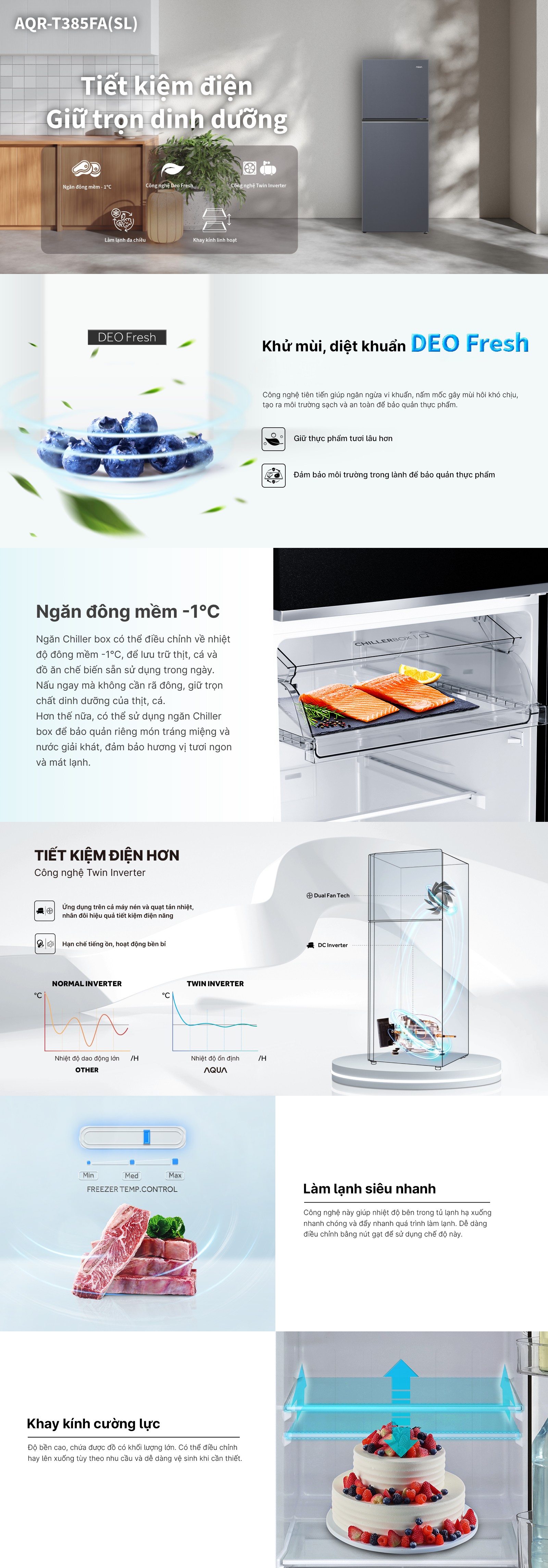 Tóm lại, Aqua AQR-T385FA(SL) là một sự kết hợp hoàn hảo giữa công nghệ hiện đại, hiệu suất vượt trội và thiết kế tinh tế. Đây không chỉ là thiết bị gia dụng mà còn là người bạn đồng hành tin cậy chăm sóc sức khỏe và nâng cao chất lượng cuộc sống cho gia đình bạn. Đừng chần chừ để sở hữu ngay giải pháp bảo quản thực phẩm tối ưu này.