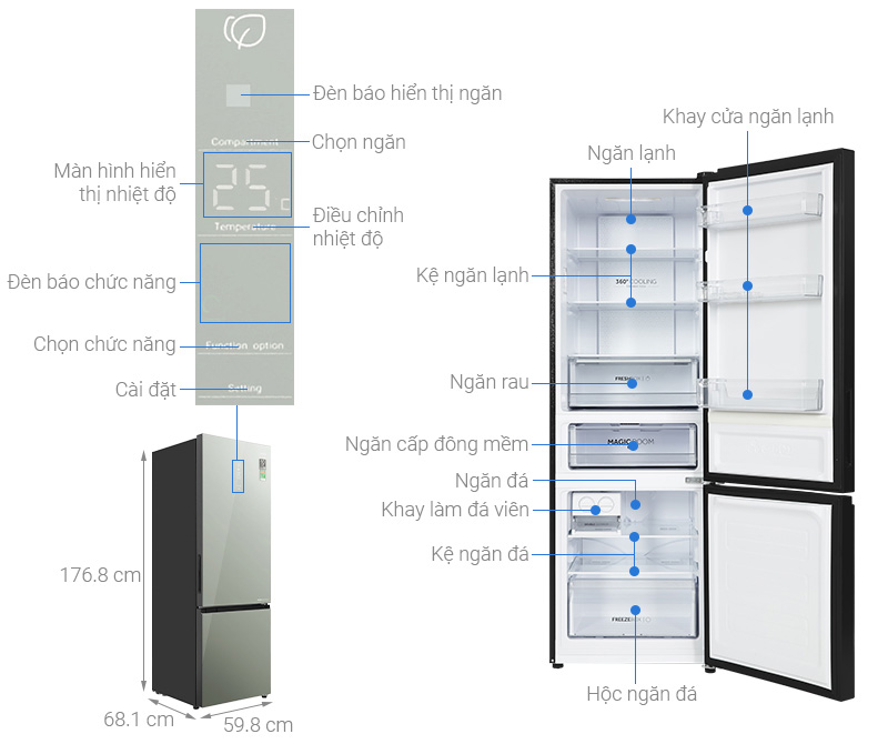 | Tiện ích | - Làm lạnh nhanh - Hộp đá xoay di động - Chức năng thông minh tự điều chỉnh nhiệt độ từng ngăn - Bảng điều khiển cảm ứng bên ngoài cửa tủ - Làm đông nhanh |