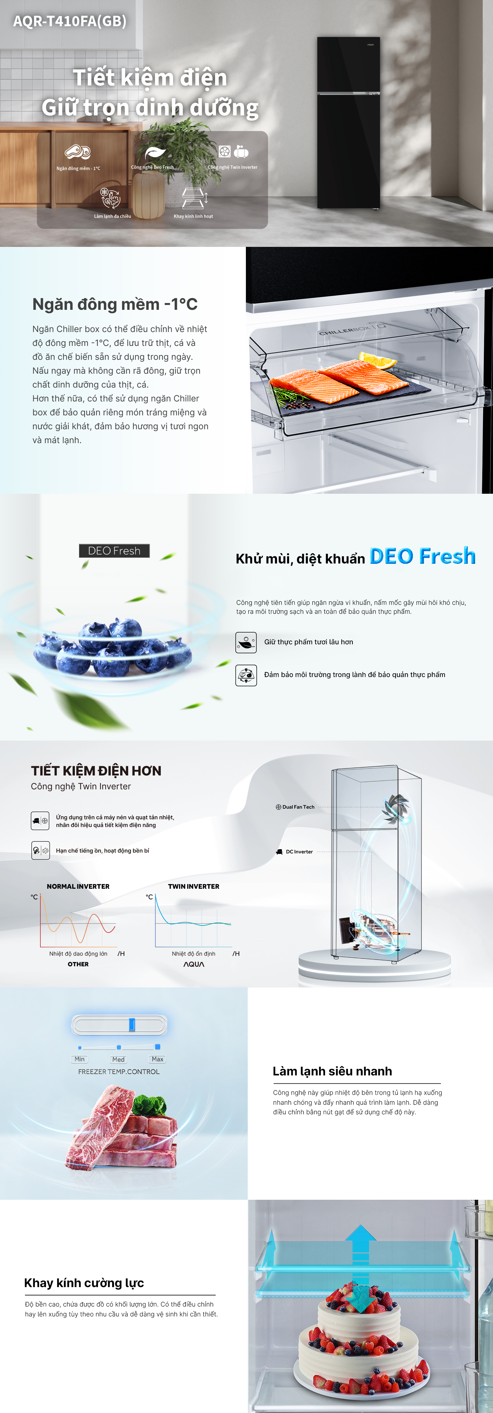 Ngay cả khi so sánh với phiên bản cấp thấp hơn là Aqua AQR-T329MA, model AQR-T410FA(GB) cho thấy sự nâng cấp rõ rệt về dung tích thực và tích hợp đầy đủ hơn các chế độ làm lạnh nhanh, giúp đáp ứng nhu cầu của gia đình từ 3 đến 5 thành viên một cách thoải mái nhất.