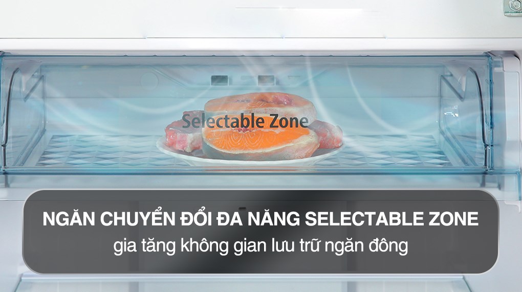 - Ngăn chuyển đổi đa năng Selectable Zone: Dễ dàng chuyển đổi nhiệt độ cài đặt cho từng loại thực phẩm, giúp bạn bảo quản thực phẩm, đồ uống với chế độ làm mát 3°C, giữ thịt, sữa ở nhiệt độ lý tưởng ở chế độ trữ lạnh và lưu trữ thịt, cá ở chế độ đông mềm -3°C tươi ngon, tiện lấy ra chế biến tức thì mà không cần rã đông.