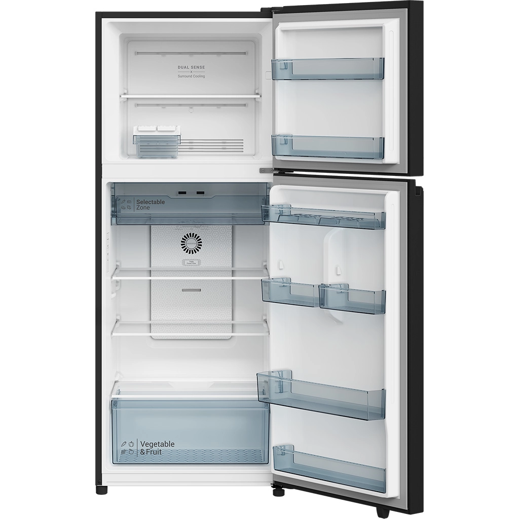 Thiết kế tông màu hiện đại tạo điểm nhấn sang trọng cho không gian bếp. Bên trong, hệ thống kệ kính cường lực chịu tải tốt, thuận tiện cho gia đình lưu trữ thực phẩm kích thước lớn. Giá kệ tại cửa có thể thay đổi độ cao theo nhu cầu, giúp tối ưu diện tích từng khu vực.