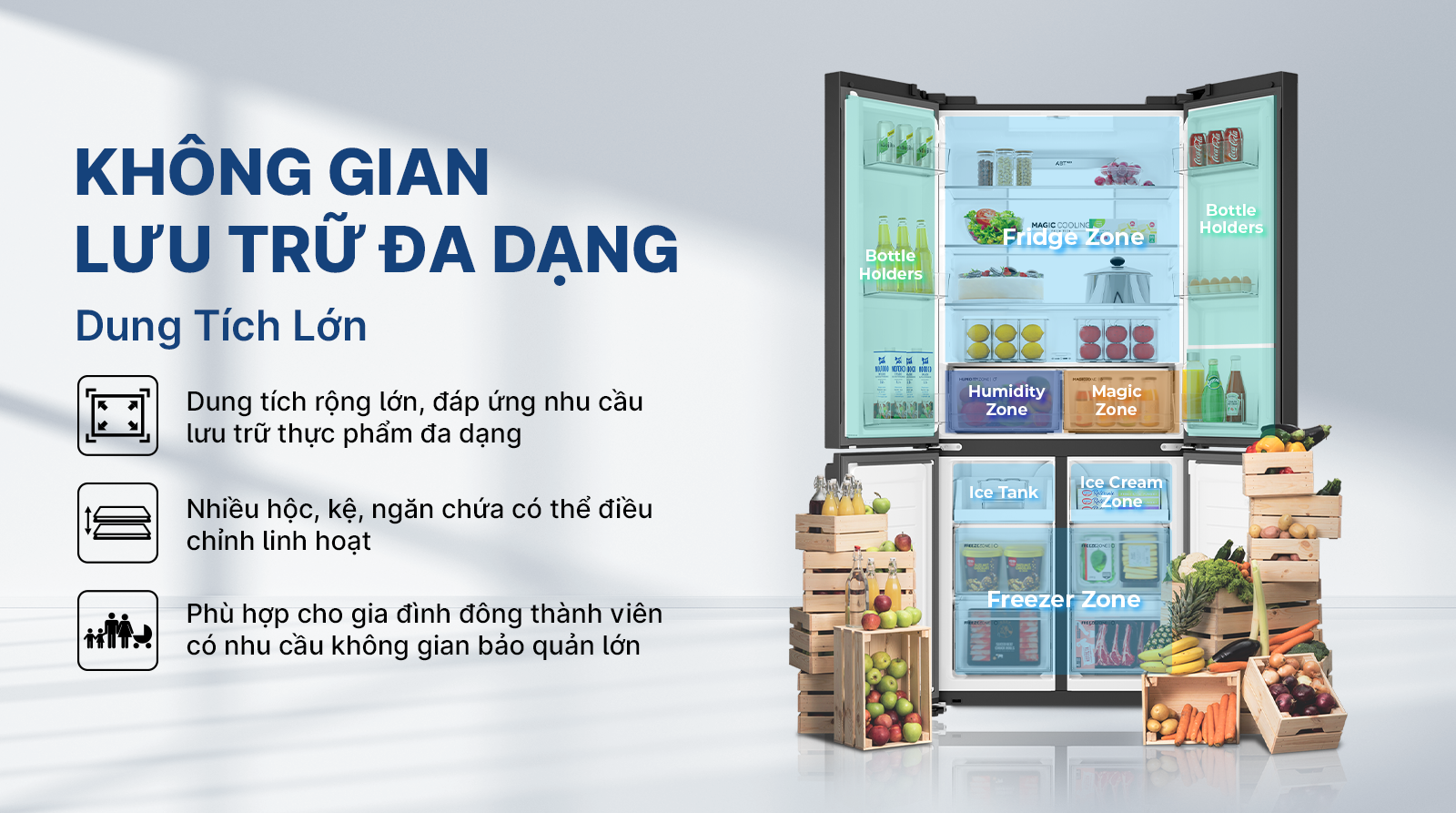 Bảo quản đa dạng thực phẩm nhờ ngăn Magic Zone điều chỉnh 0/2/4°C.