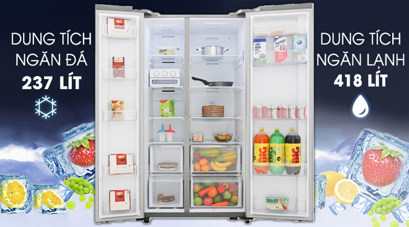 Với dung tích lớn, tủ lạnh side by side giúp bạn thoải mái lưu trữ thực phẩm cho cả tuần. Điều này đặc biệt phù hợp với các gia đình đông người hoặc những người bận rộn, không có thời gian đi chợ thường xuyên.