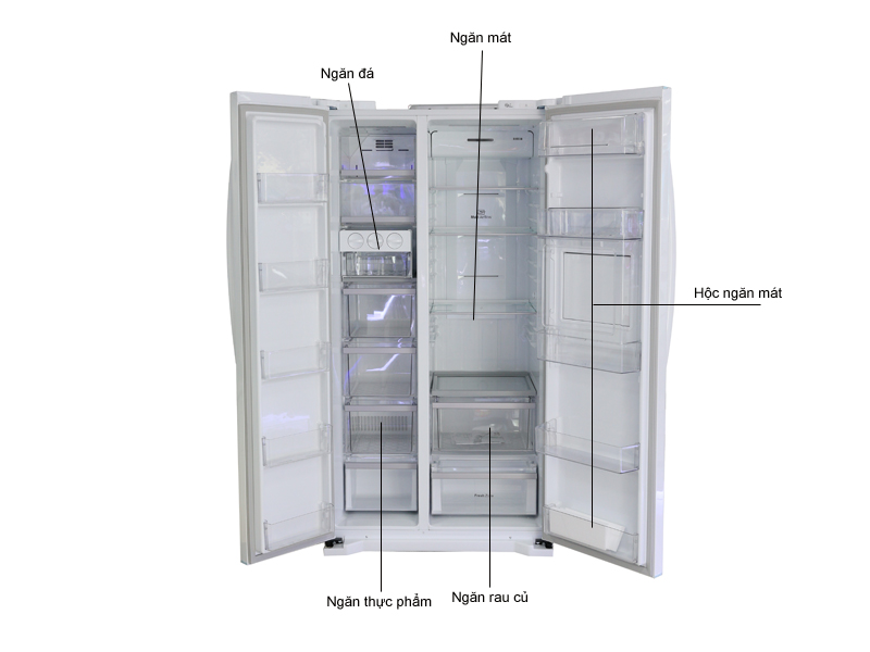 Cửa tủ được thiết kế đối xứng, giúp người dùng dễ dàng lấy thực phẩm mà không cần mở toàn bộ tủ. Các ngăn chứa được bố trí hợp lý, tối ưu hóa không gian lưu trữ.
